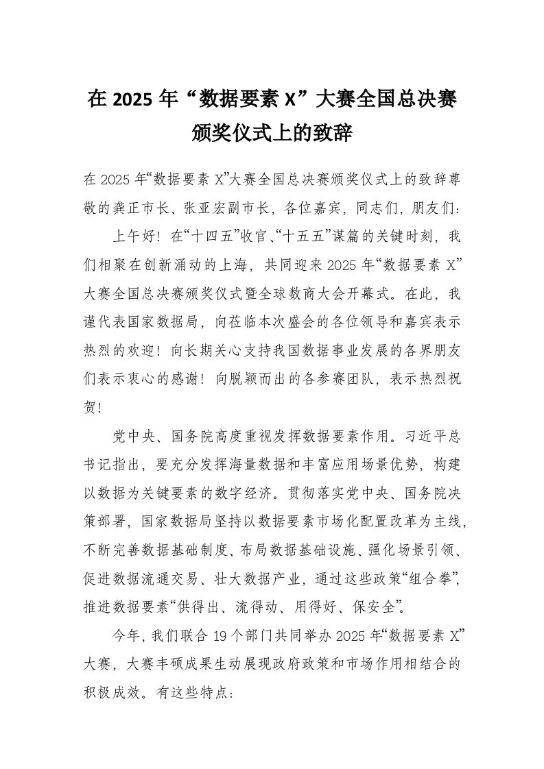 在2025年“数据要素X”大赛全国总决赛颁奖仪式上的致辞