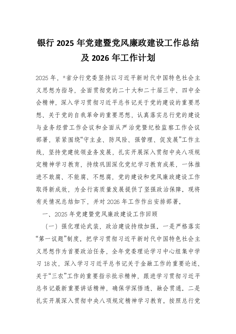 银行2025年党建暨党风廉政建设工作总结及2026年工作计划