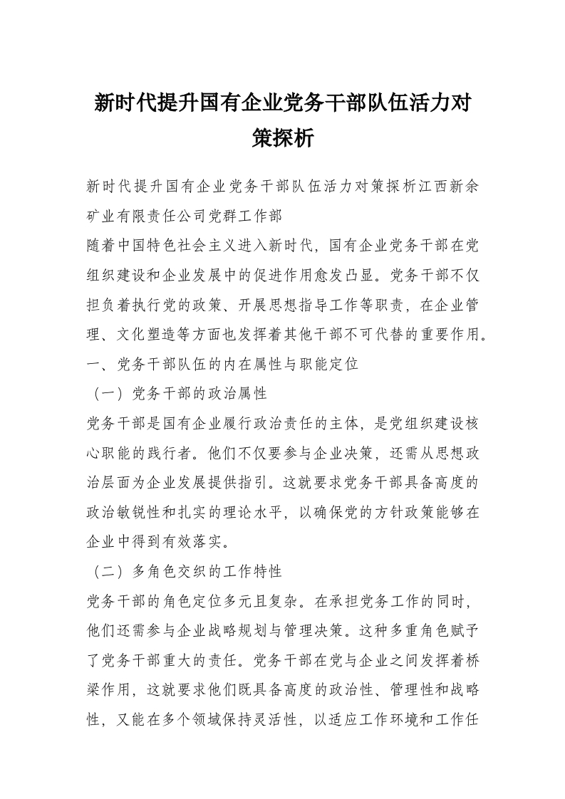 新时代提升国有企业党务干部队伍活力对策探析
