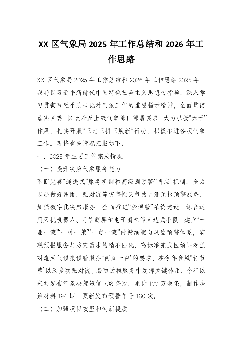 XX区气象局2025年工作总结和2026年工作思路