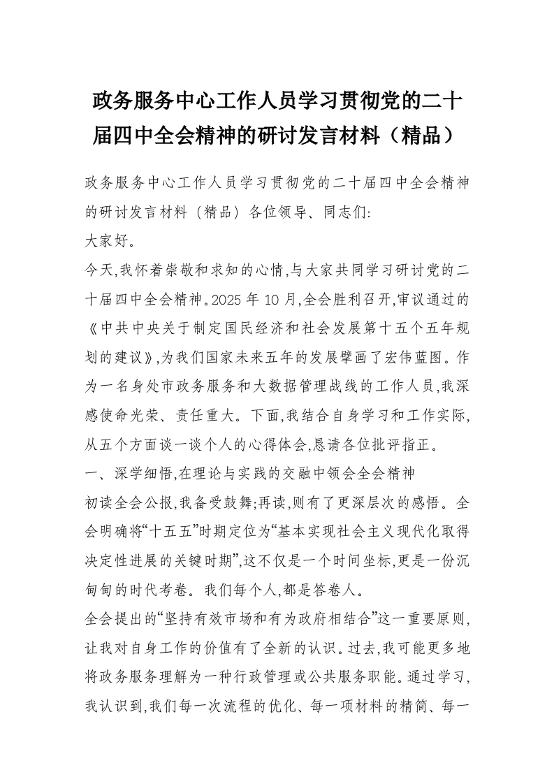 政务服务中心工作人员学习贯彻党的二十届四中***精神的研讨发言材料(精品)