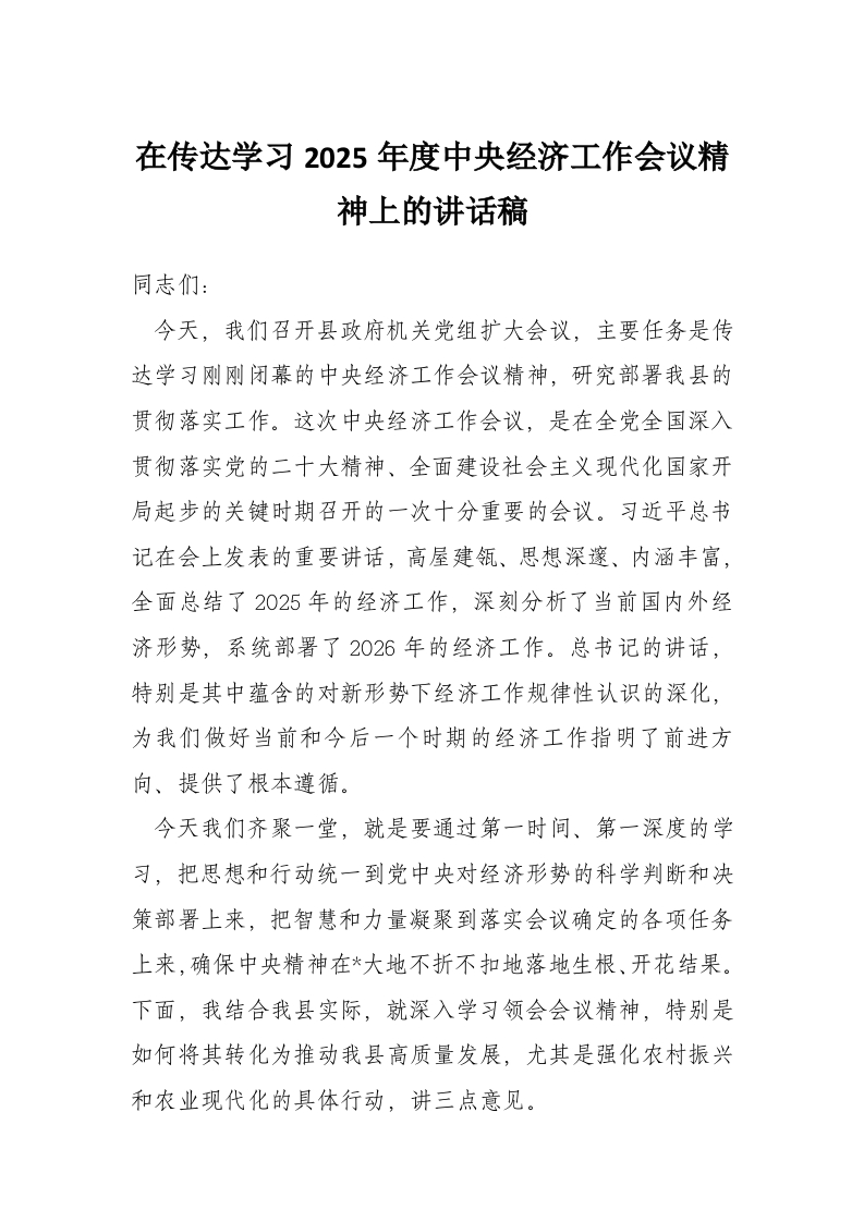 在传达学习2025年度中央经济工作会议精神上的讲话稿