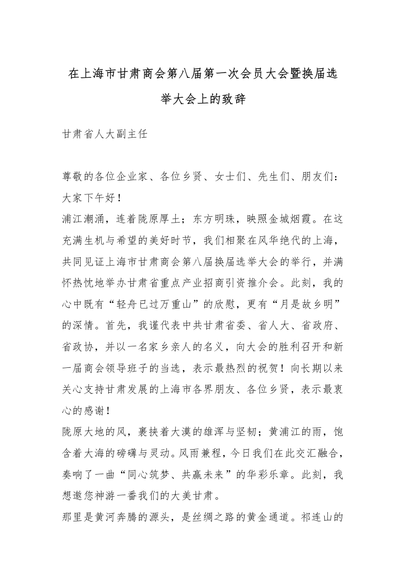 在上海市甘肃商会第八届第一次会员大会暨换届选举大会上的致辞_副本