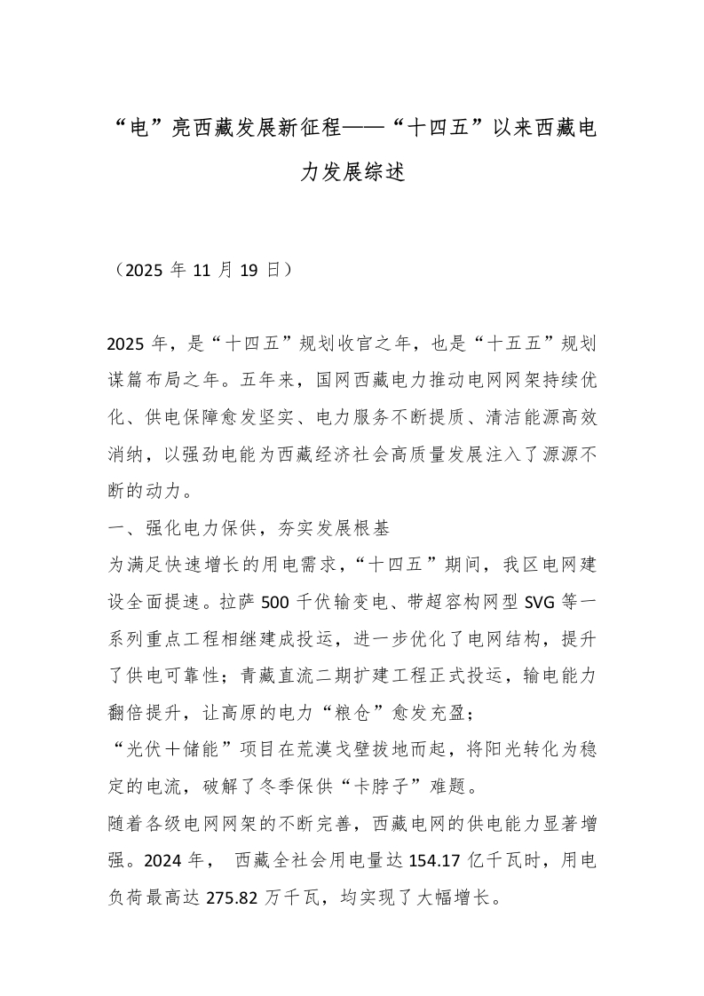 首页精选范文“电”亮西藏发展新征程——“十四五”以来西藏电力发展综述_副本