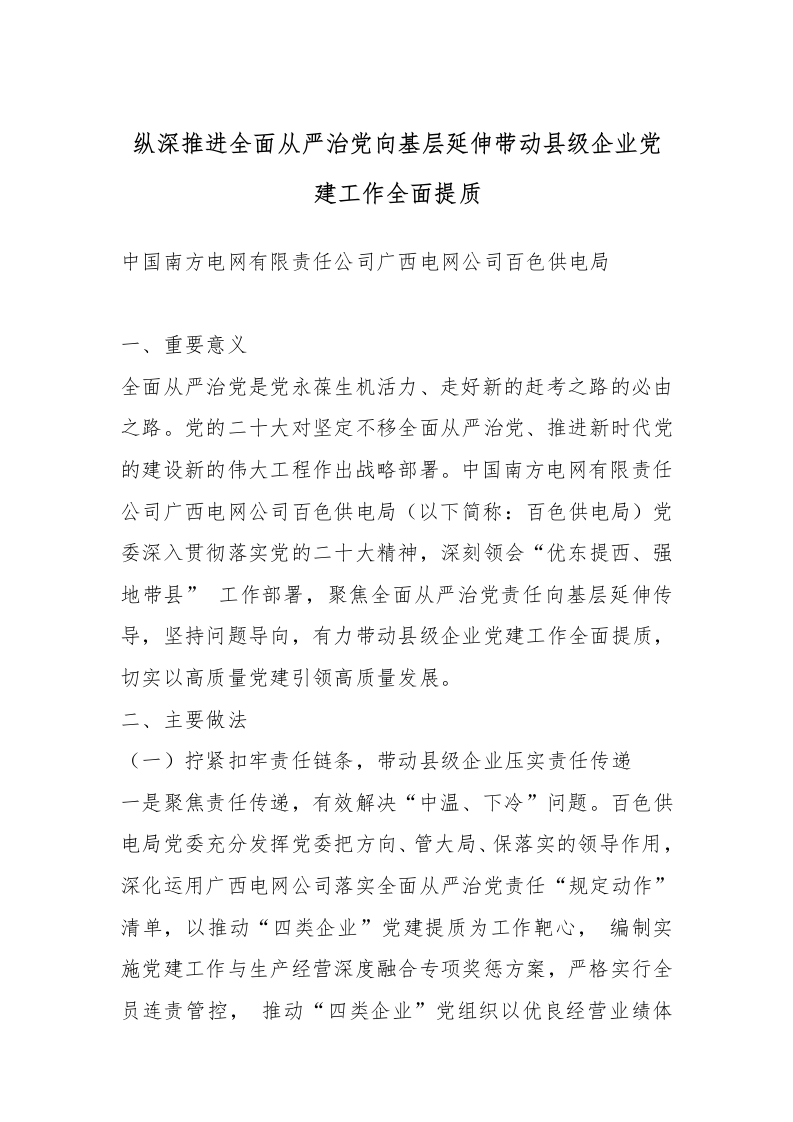 纵深推进全面从严治党向基层延伸带动县级企业党建工作全面提质_副本