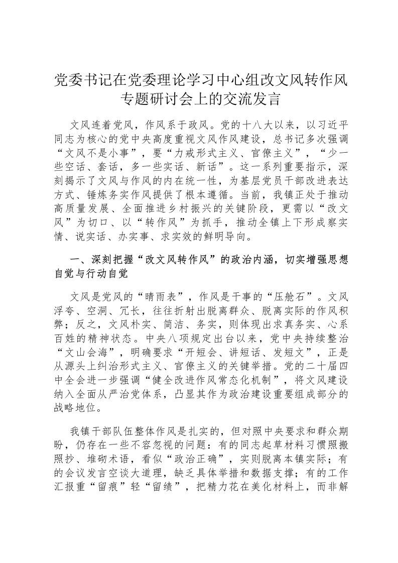 党委书记在党委理论学习中心组改文风转作风专题研讨会上的交流发言