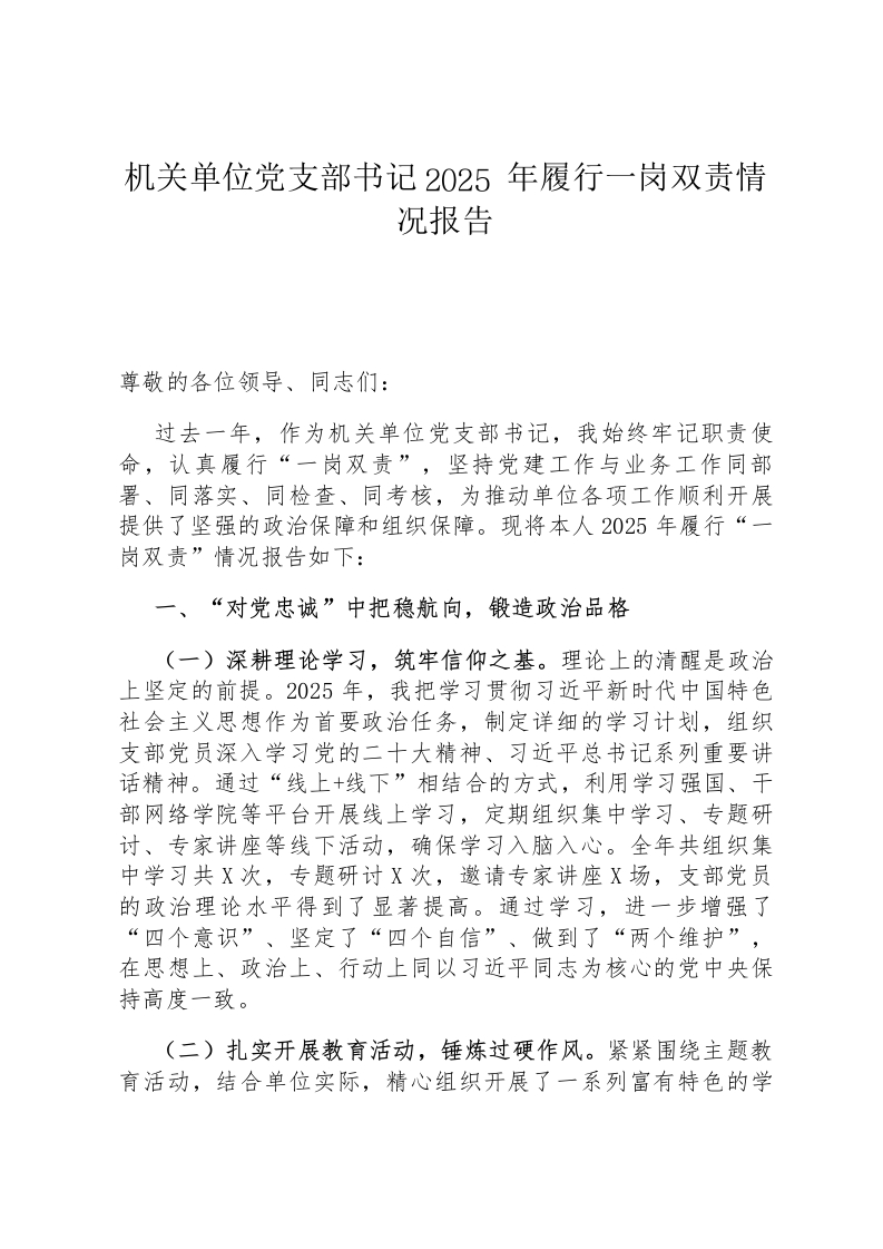 首页讲课讲稿机关单位党支部书记2025年履行一岗双责情况报告