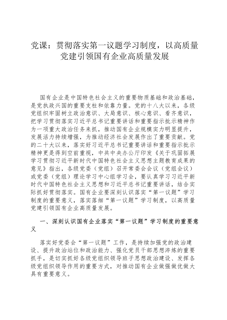 党课:贯彻落实第一议题学习制度,以高质量党建引领国有企业高质量发展