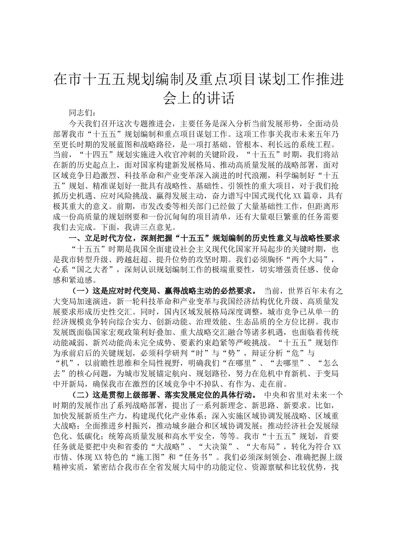 在市十五五规划编制及重点项目谋划工作推进会上的讲话