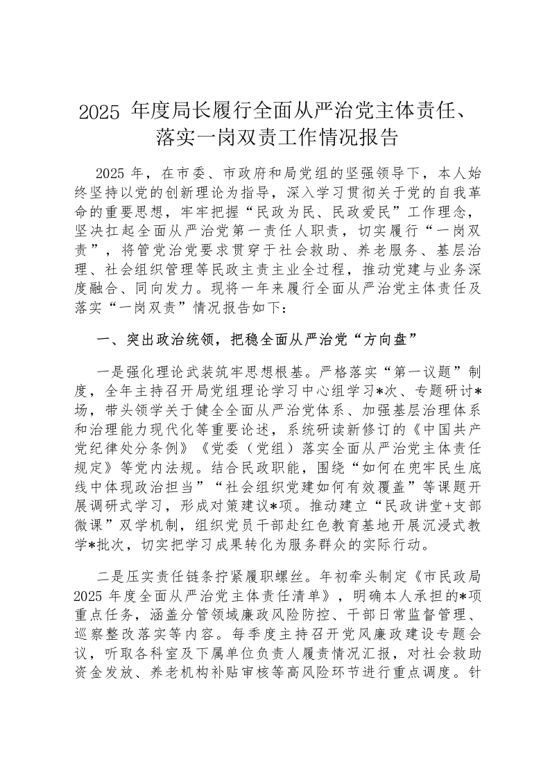 2025年度局长履行全面从严治党主体责任、落实一岗双责工作情况报告