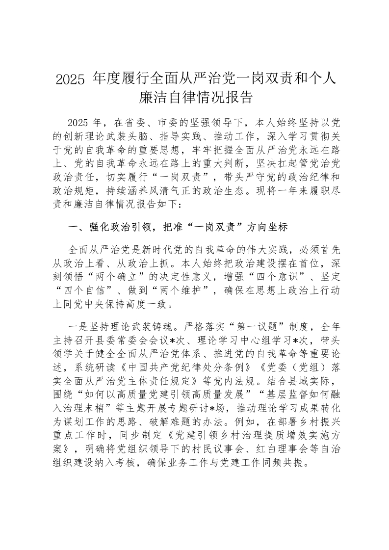2025年度履行全面从严治党一岗双责和个人廉洁自律情况报告