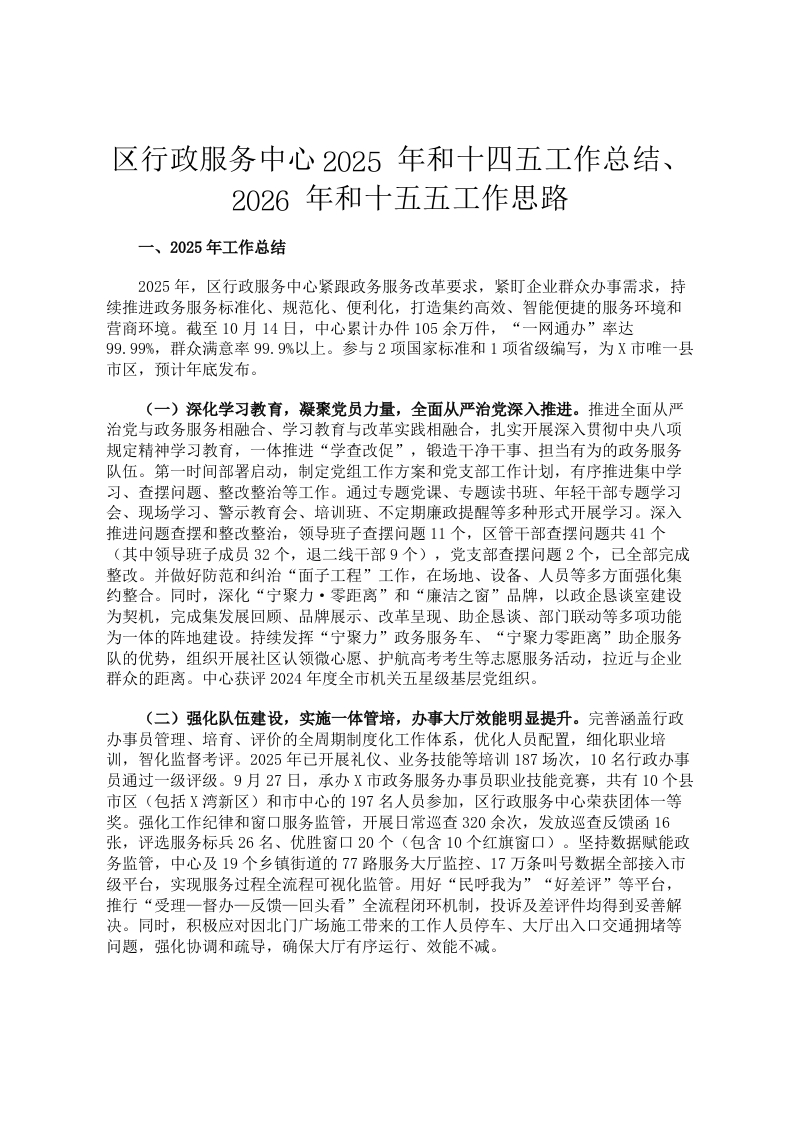 区行政服务中心2025年和十四五工作总结、2026年和十五五工作思路