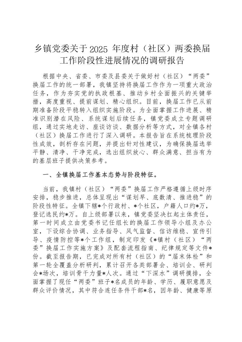 乡镇党委关于2025年度村(社区)两委换届工作阶段性进展情况的调研报告