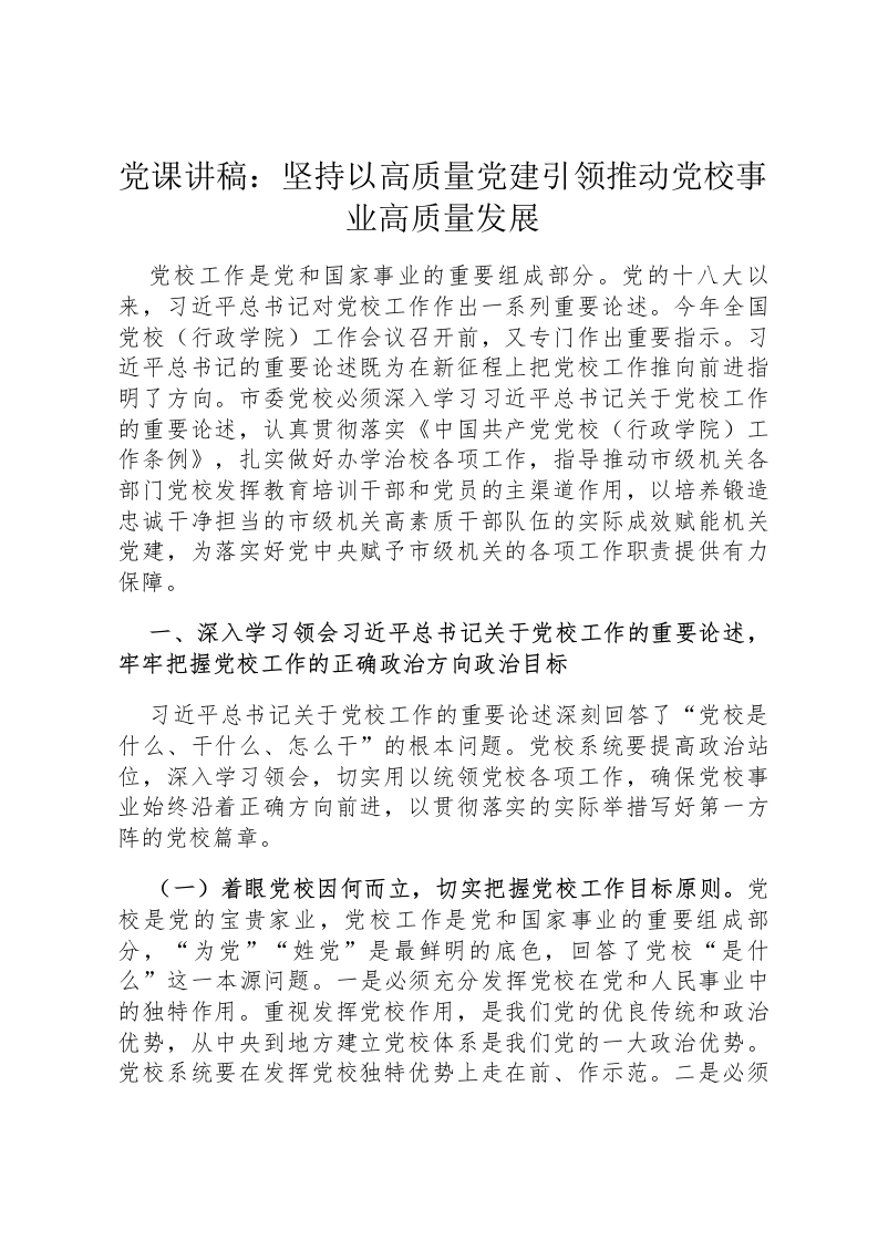 党课讲稿:坚持以高质量党建引领推动党校事业高质量发展