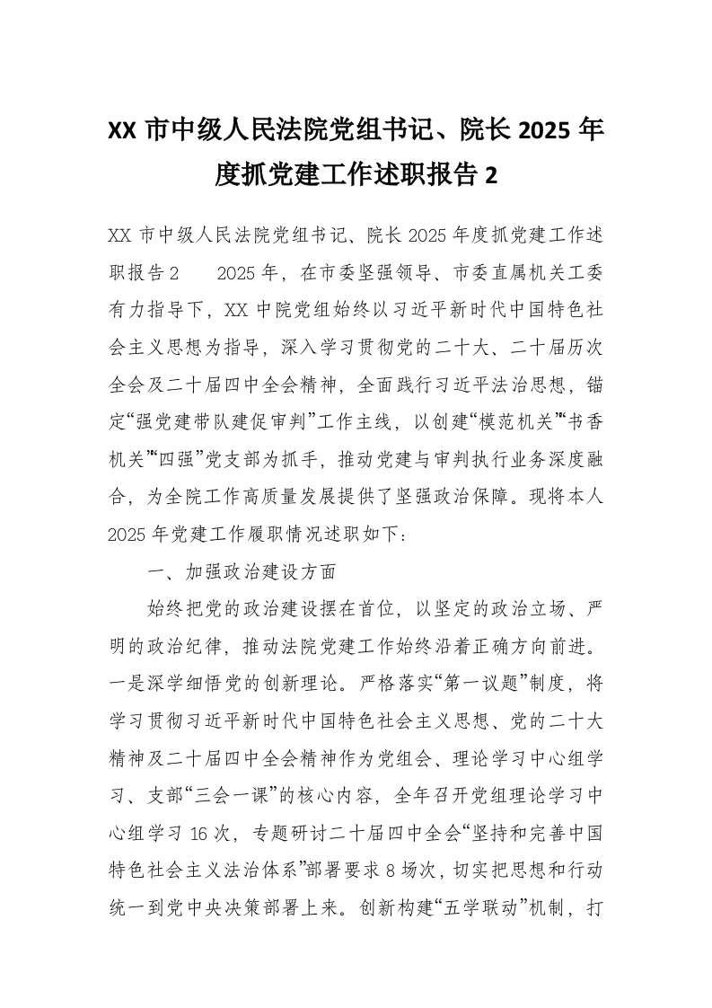 XX市中级人民法院党组书记、院长2025年度抓党建工作述职报告2