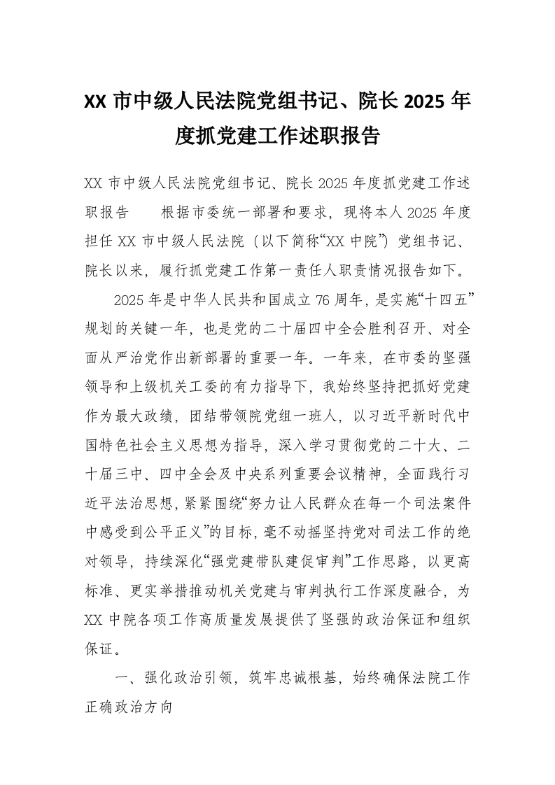 XX市中级人民法院党组书记、院长2025年度抓党建工作述职报告