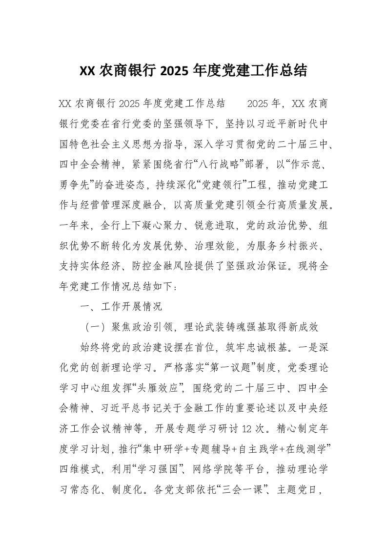 首页讲课讲稿XX农商银行2025年度党建工作总结