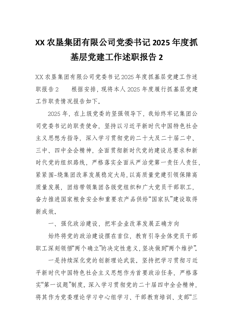 XX农垦集团有限公司党委书记2025年度抓基层党建工作述职报告2
