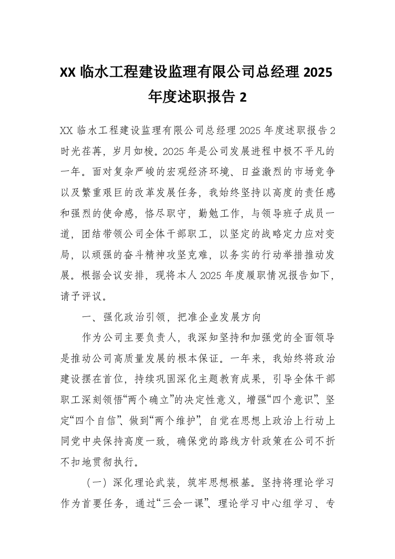 XX临水工程建设监理有限公司总经理2025年度述职报告2