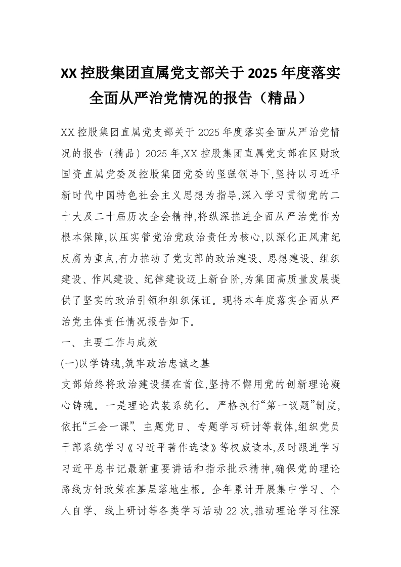 首页讲课讲稿XX控股集团直属党支部关于2025年度落实全面从严治党情况的报告(精品)