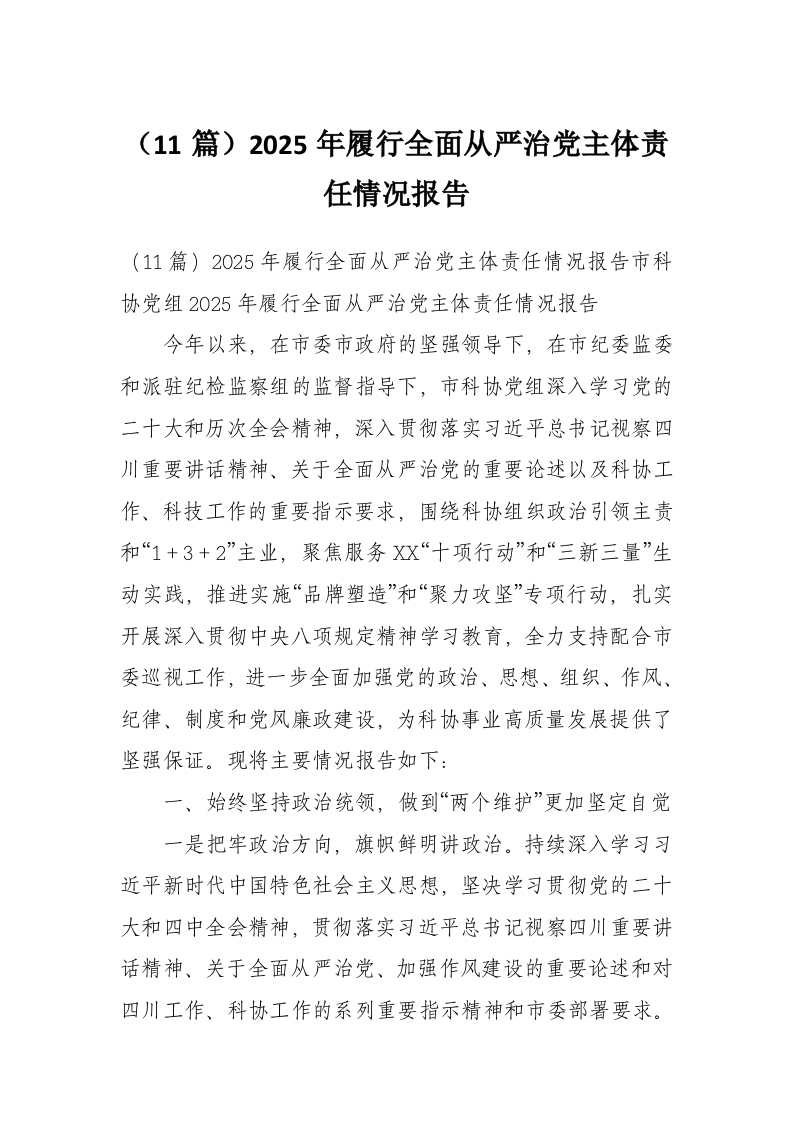 (11篇)2025年履行全面从严治党主体责任情况报告