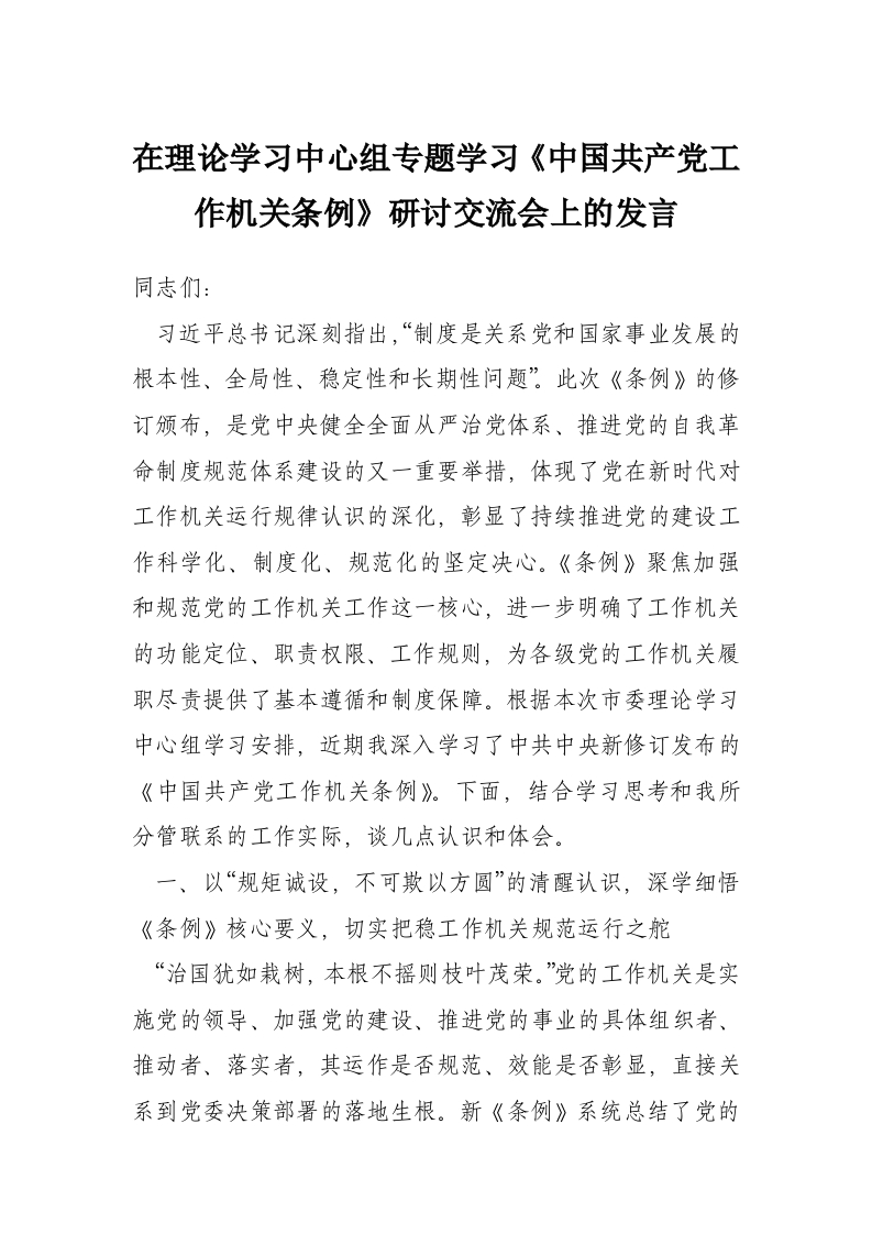 在理论学习中心组专题学习《中国***工作机关条例》研讨交流会上的发言