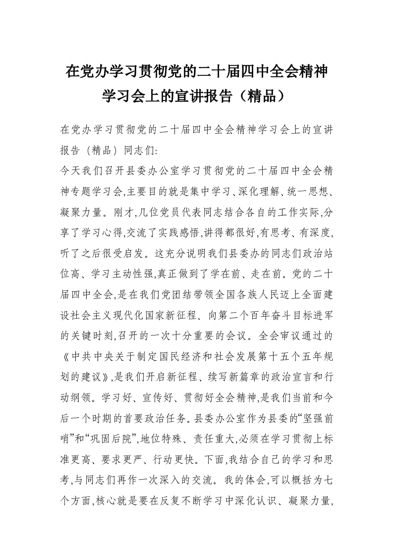 首页材料汇编在党办学习贯彻党的二十届四中***精神学习会上的宣讲报告(精品)