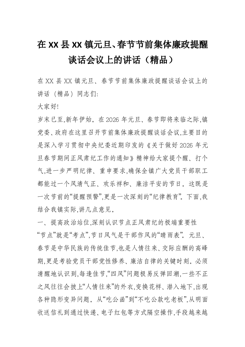 在XX县XX镇元旦、春节节前集体廉政提醒谈话会议上的讲话(精品)