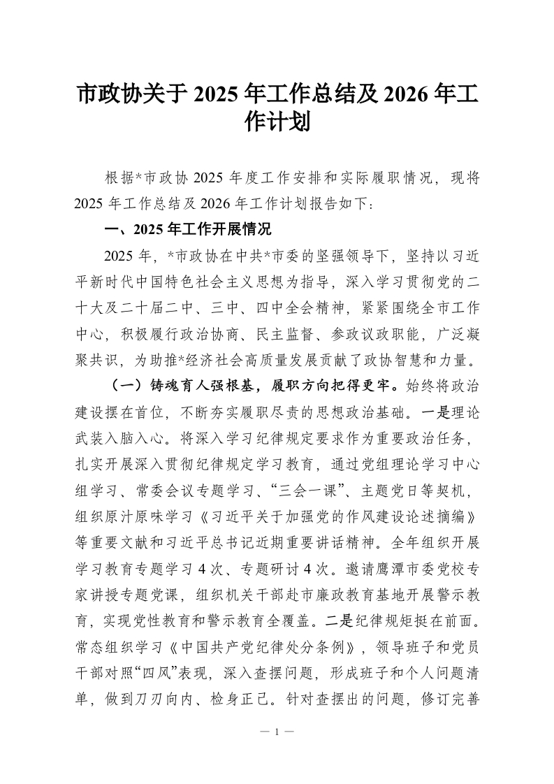 首页工作文档市政协关于2025年工作总结及2026年工作计划