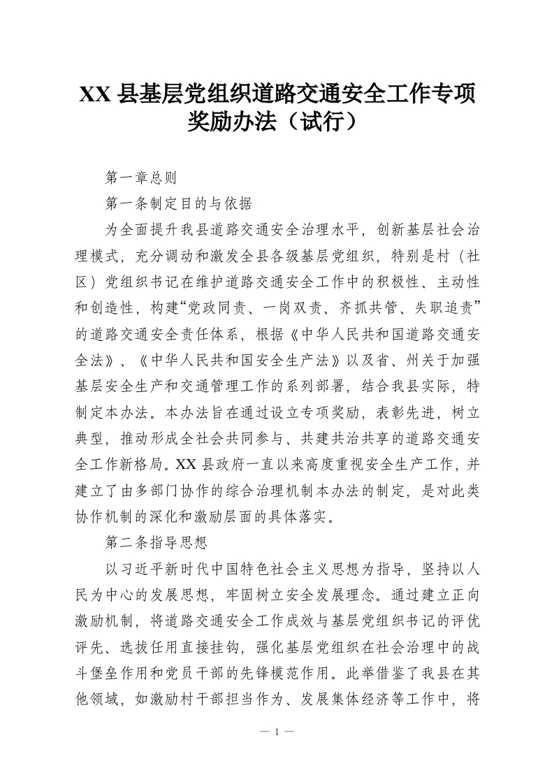 首页工作文档XX县基层党组织道路交通安全工作专项奖励办法(试行)