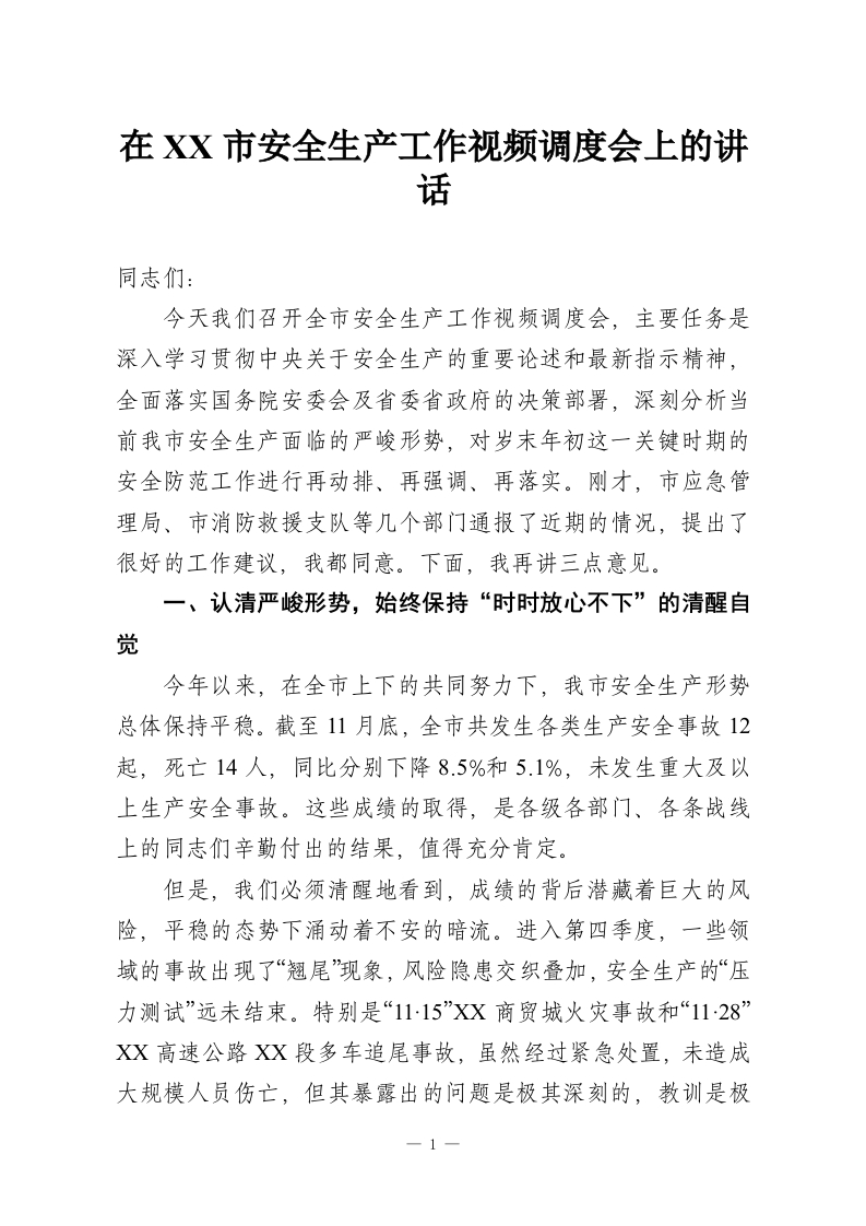 在XX市安全生产工作视频调度会上的讲话