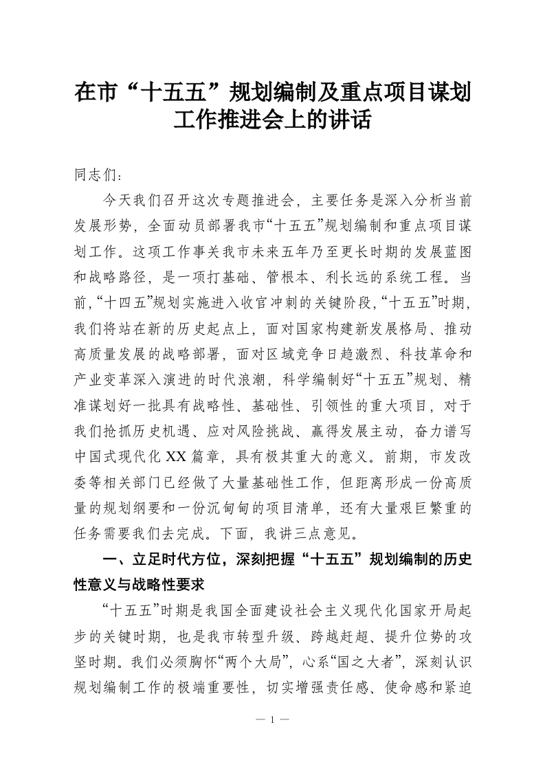 在市“十五五”规划编制及重点项目谋划工作推进会上的讲话