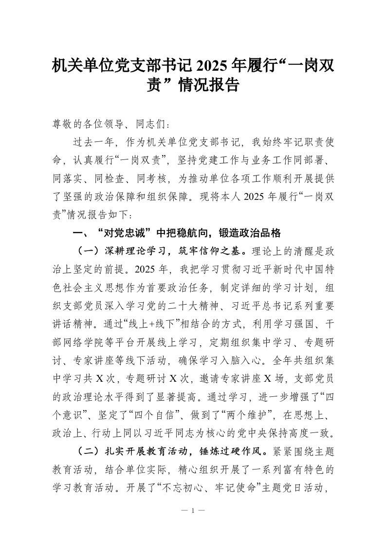 机关单位党支部书记2025年履行“一岗双责”情况报告