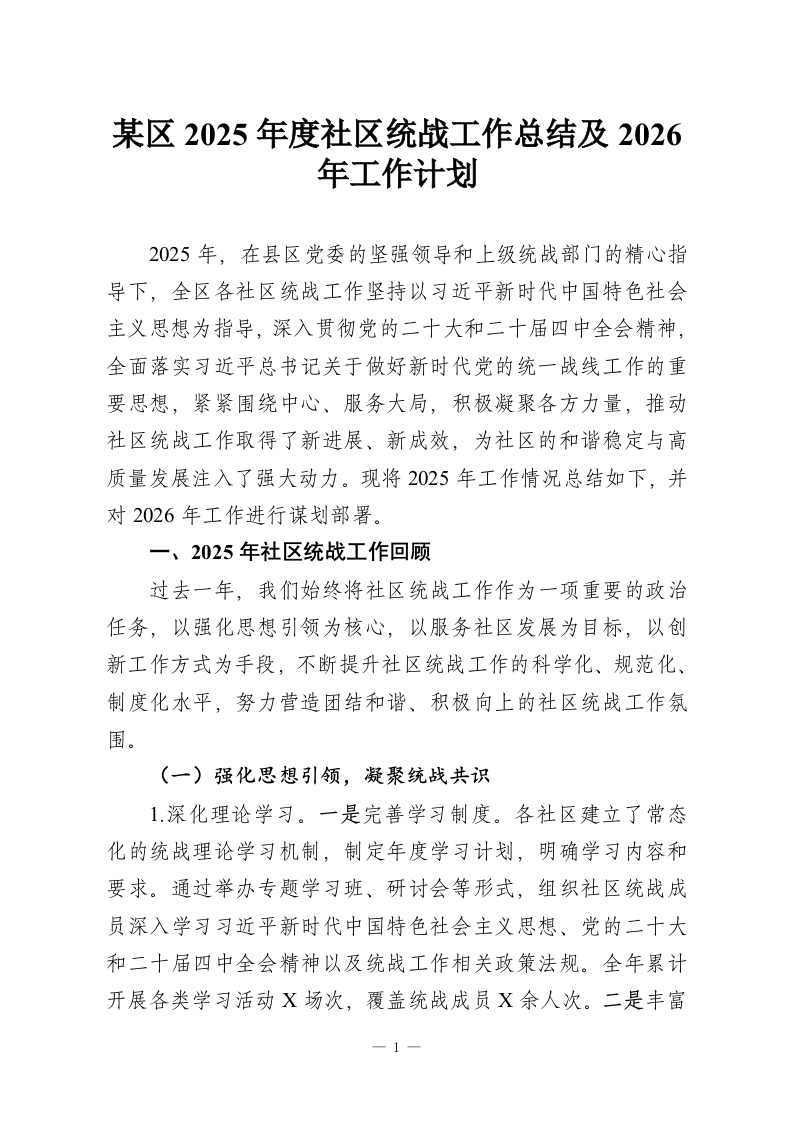 某区2025年度社区统战工作总结及2026年工作计划